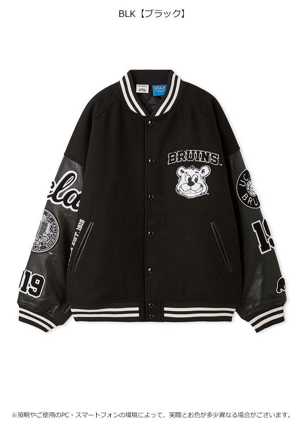 今季注目のカレッジムード満載なデザインで、胸元や袖・背中部分に「UCLA」のマスコットのクマの「ジョー」やUCLAの特別なロゴをあしらった大ぶりのサガラ刺繍ワッペンを贅沢に配置しました。オーバーサイズで仕上げているので、メンズのジャケットを羽織っているようなラフさが魅力です。