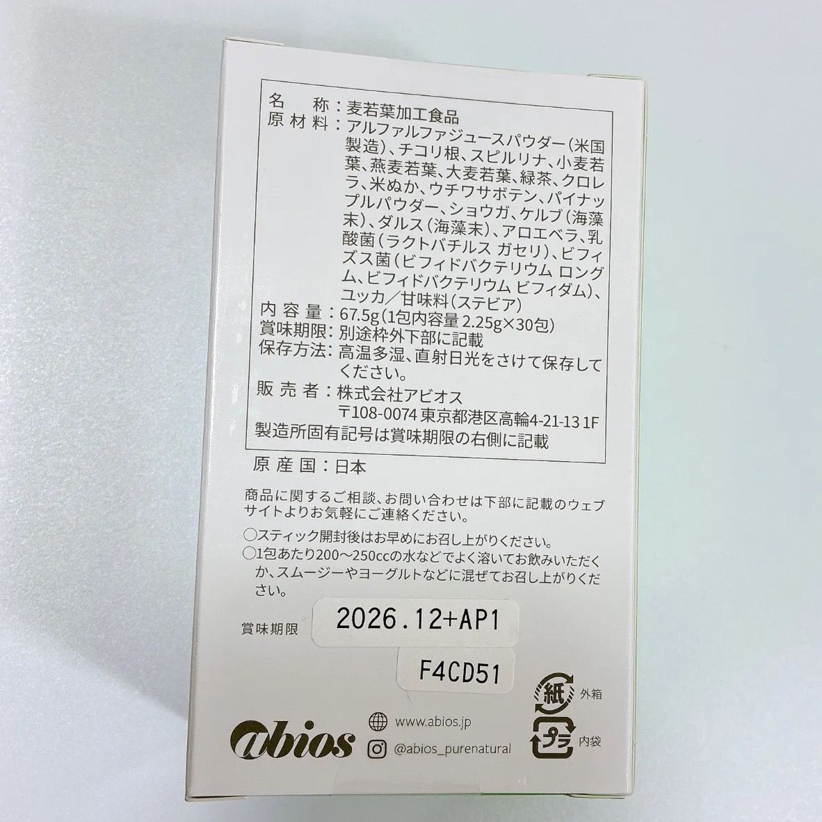 アルファルファジュースパウダー、チコリ、スピルリナ、小麦若葉 、燕麦若葉 、大麦若葉、緑茶、クロレラ、米ぬか、ウチワサボテン、パイナップルパウダー 、ショウガ 、ケルプ(海藻エキス) 、ダルス(海藻エキス) 、アロエベラ、乳酸菌(ラクトバチルス ガセリ、ビフィドバクテリウム ロングム、ビフィドバクテリウム ビフィダム) 、ユッカ 、甘味料(ステビア)