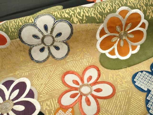平和屋着物 アンティーク 大正ロマン 丸帯 引き抜き帯 駒刺繍 舞花文 金彩 正絹 hy