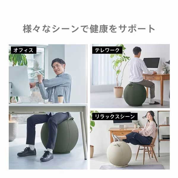「バランスボール」としてストレッチやトレーニングに使用したり、デスクワーク症候群対策に仕事や作業用の「椅子」としての使用もおすすめです。リラックスタイムにはソファの前に設置して足を置くことで、「オットマン」としても使えます。