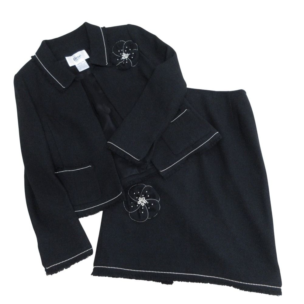 Rene ルネ カメリア付き ツイードジャケット スカート スーツ セットアップ サイズ38 ブラック レディース 古着