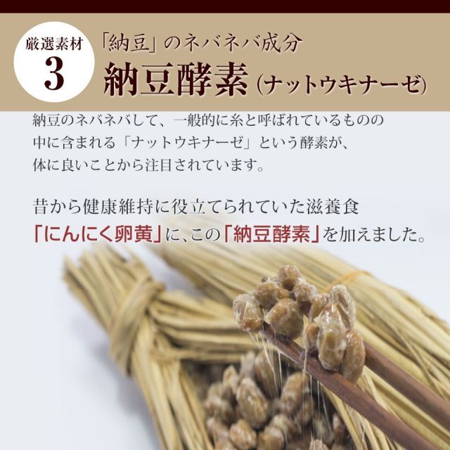 南九州に伝わる伝統食「にんにく卵黄」に、今注目の納豆酵素「ナットウキナーゼ」を加えました。原材料にもこだわり、品質のよい青森県のにんにくと、新鮮な有精卵をぜいたくに使用しています。