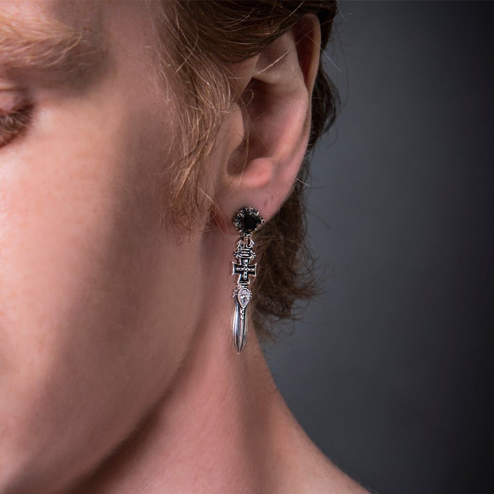 Courage and refined taste at the ear—the Crown Sword Earring stages a dramatic vertical trio of motifs: crown, cross, and sword. A jet-black cubic zirconia sets a poised tone, while the cross is finished with black enamel for added depth and modern edge. Long revered as emblems of bravery and justice, the sword’s sharp silhouette mirrors unwavering resolve. Crafted in SV925 and finished one by one by master artisans in atelier workshops, the piece distills pure savoir-faire—elevating jewelry into an art object. Worn solo on one ear, it imprints everyday looks with bold character and radiates singular presence on special occasions. A precise harmony of classic and contemporary—truly wearable art.