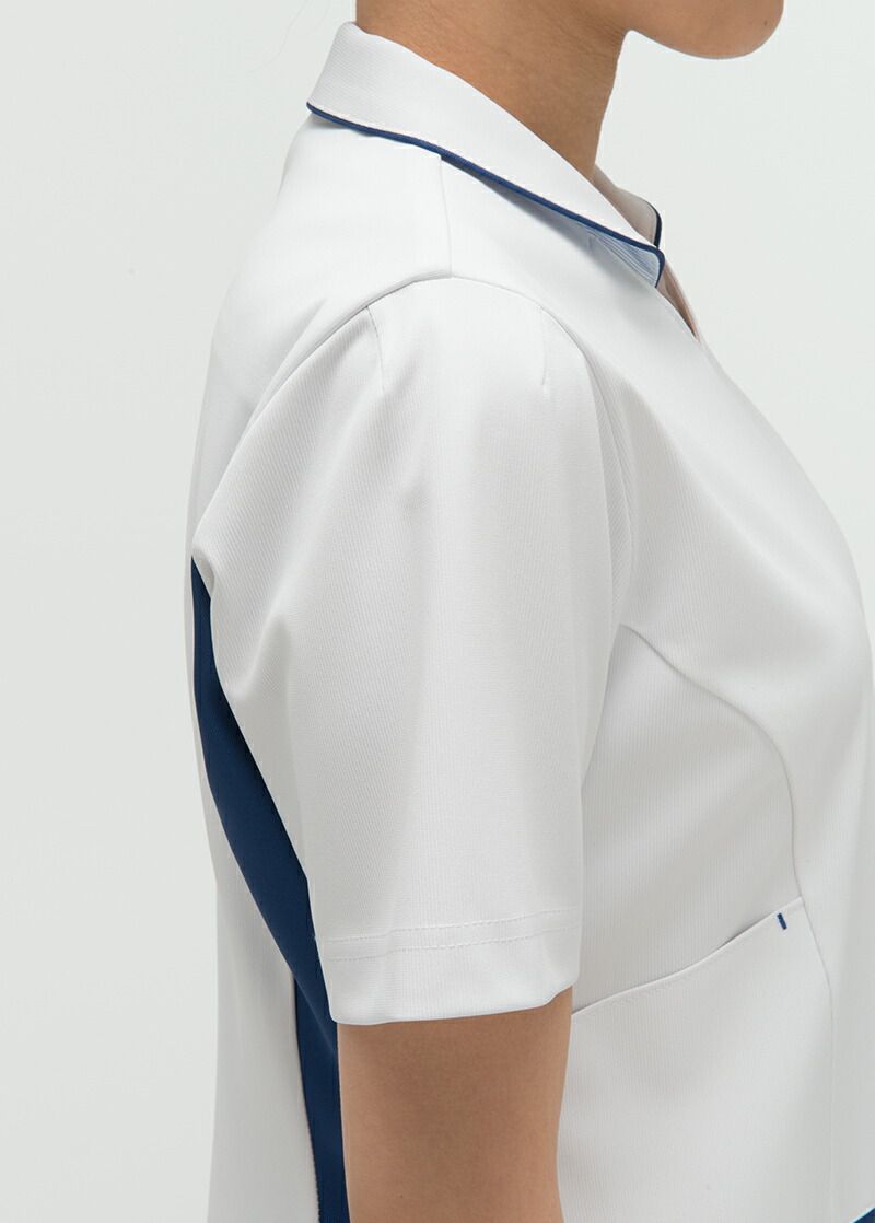 白衣とスクラブのハイブリッドタイプです。それぞれの優れたところを併せ持つニューアイテムです。シャープな衿周りとフロントファスナー開きがポイントです。デザインにプラスして機能的な素材がナースの仕事を支えます。