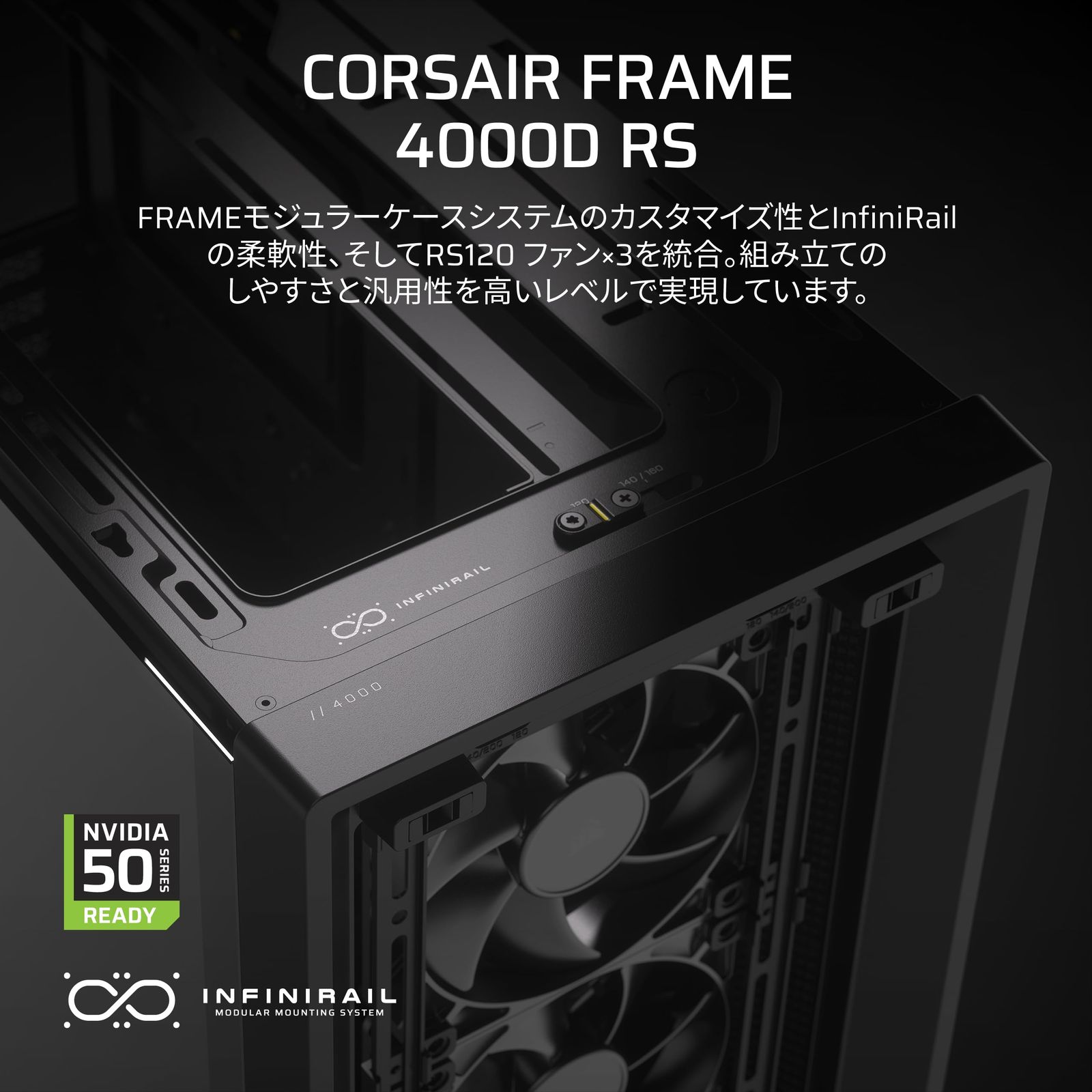 CORSAIR InfiniRail機能を搭載。可動式のファンマウントにより、最大200mm径と幅広いファンの選択肢を提供します。また、標準でフロントにRS120 120mmファンを3基搭載しています。
