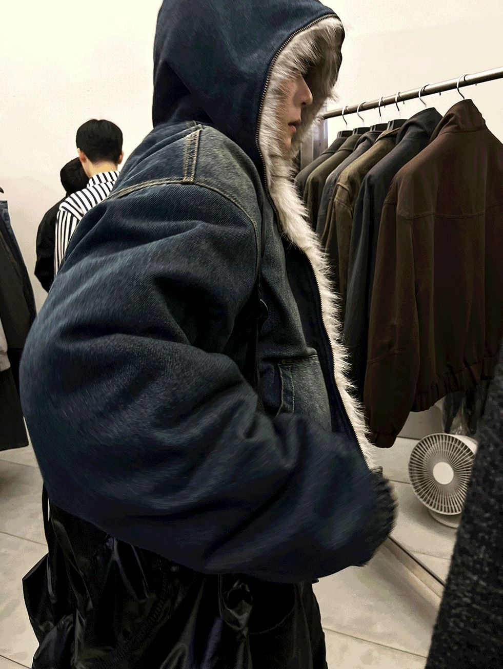 COSYHARU Nunil fur trim hooded dark blue jumper