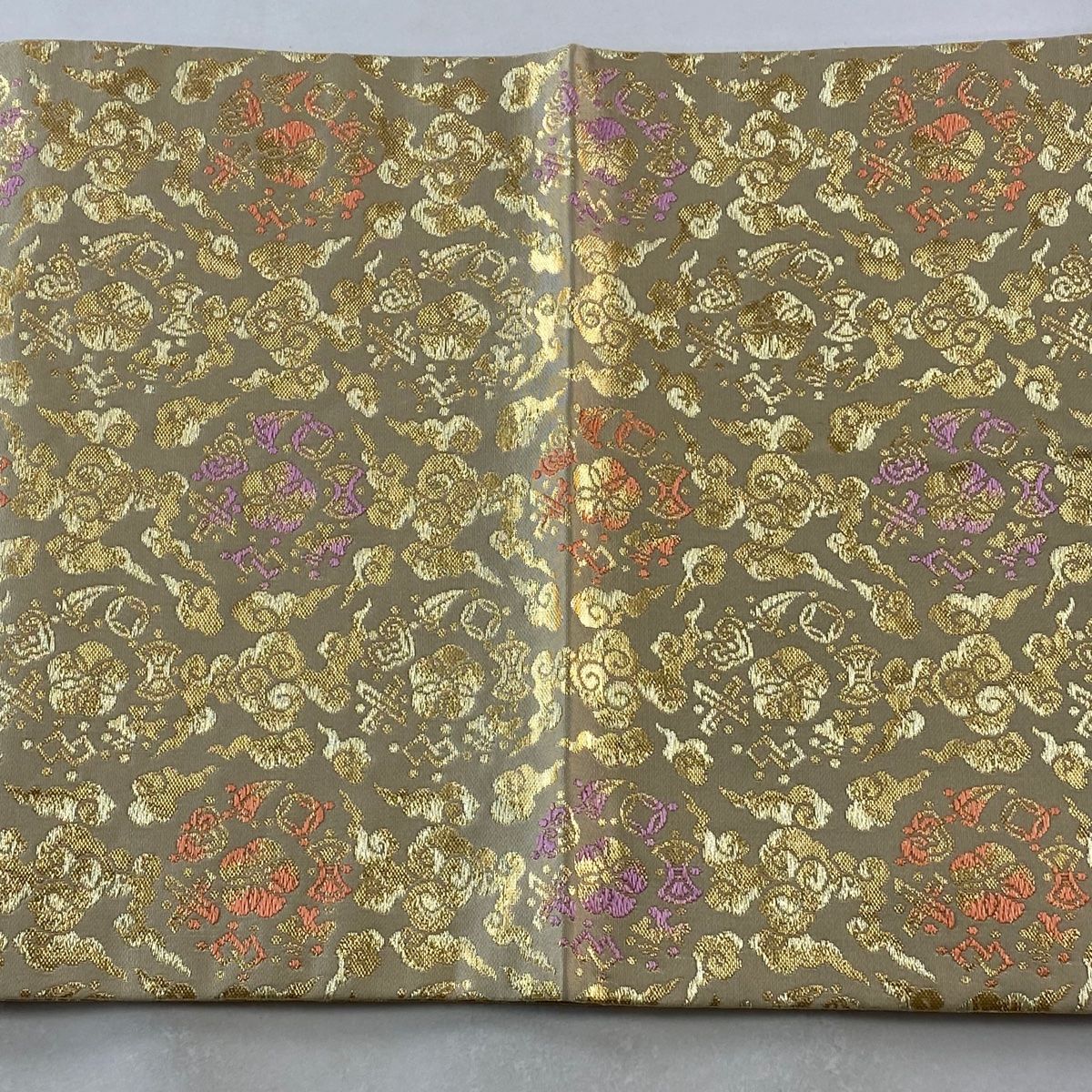 開き名古屋帯 龍村美術織物 落款 宝雲梅花文 草花 金糸 箔 ベージュ 正絹