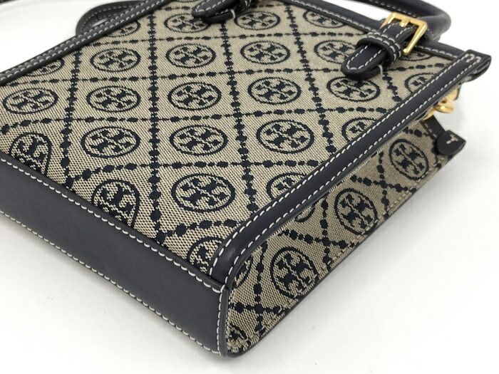 TORY BURCH ジャガード 2 WAYショルダー トートバッグ レザー キャンバス ネイビー ベージュ