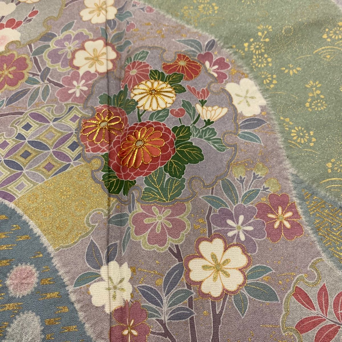 訪問着 身丈161.5 cm 裄丈64 M 袷 バチ衿 雪輪 草花 銀通し 金彩 灰緑 正絹 秀品