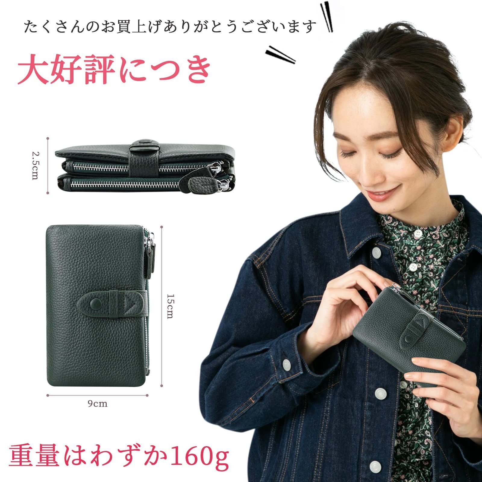 [F.ZH] 二つ折り財布 レディース 短財布 本革製 小銭入れ付 18カード入れ お札入れ 大容量 小型 軽量 多機能 ダブルボタン ダブルファスナー クリスマス 母の日プレゼント 自分用もプレゼント用も最適 (ダークグリーン)