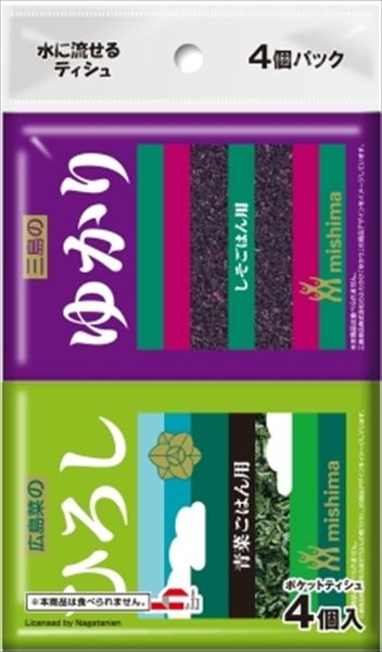 三島食品の人気ふりかけ柄ポケットティシュ。中の個包装は、ゆかり・うめこ・かおり・あかり・ひろしの5柄のデザインが施されている。