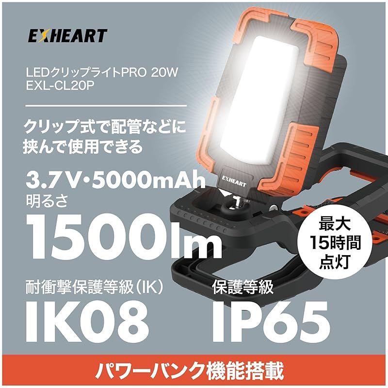 EXHEART LEDクリップライトPRO 20 W クリップライト 充電式 昼光色 USB充電式 3 7 V 5000 mAh 1500ルーメン ワークライト 投光器 LEDライト 作業ライト 作業灯 工事用照明 屋外照明 折りたたみ 屋外 倉庫 現場