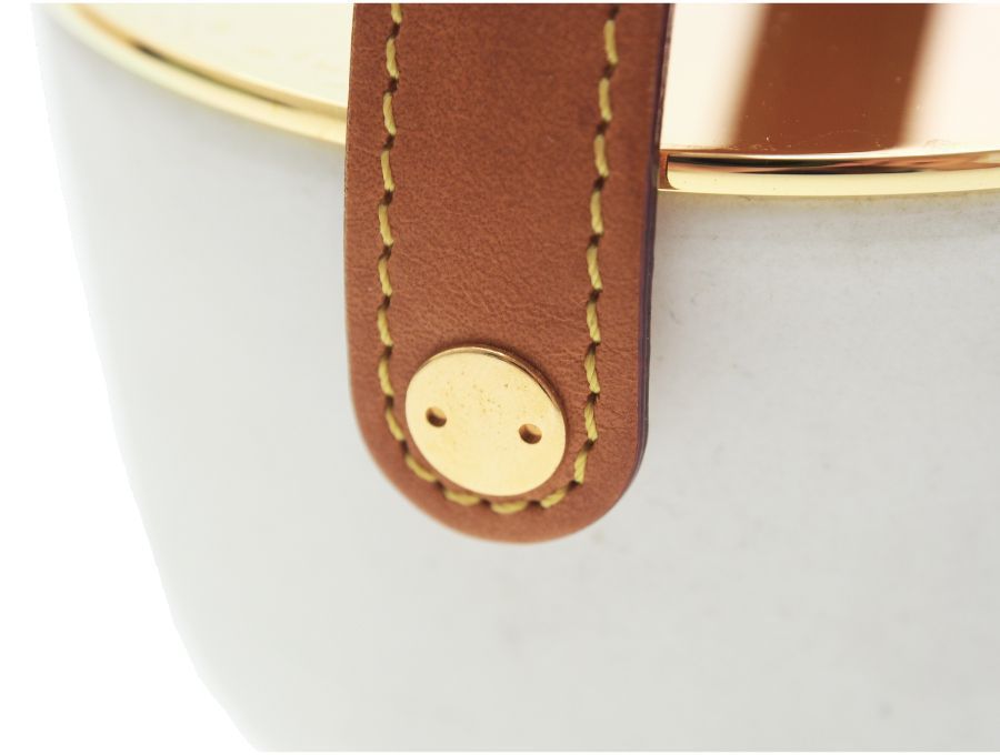 ルイヴィトンのアロマキャンドルです。ゴールドの蓋の中央にはLVのロゴが入っており、白の陶器製キャンドルカバーのセンターにはLOUIS VUITTONのロゴが刻まれ、ストラップにはレザーのヌメ革が取り付けられており高級感いっぱいのアロマキャンドルになります。数回使用されていて芯は黒くなっていますが蓋を開けただけでもほのかにアロマが香るので、お部屋に飾っておくだけでもとても素敵な空間になる事間違いなしです。