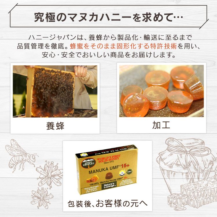 世界初となるUMF蜂蜜協会認定ののど飴(ロゼンジ)ハニードロップレットが誕生しました。
