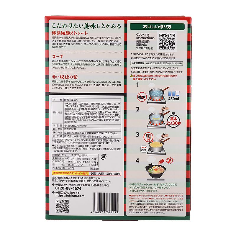 セット 一蘭ラーメン 博多細麺ストレート 129 g×5食 スープ 赤い秘伝の粉 唐辛子 宅急便