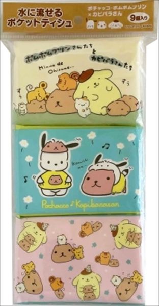サンリオの人気キャラクターポチャッコとポムポムプリンがカピバラさんと夢のコラボ。水に流せるポケットティシュです。