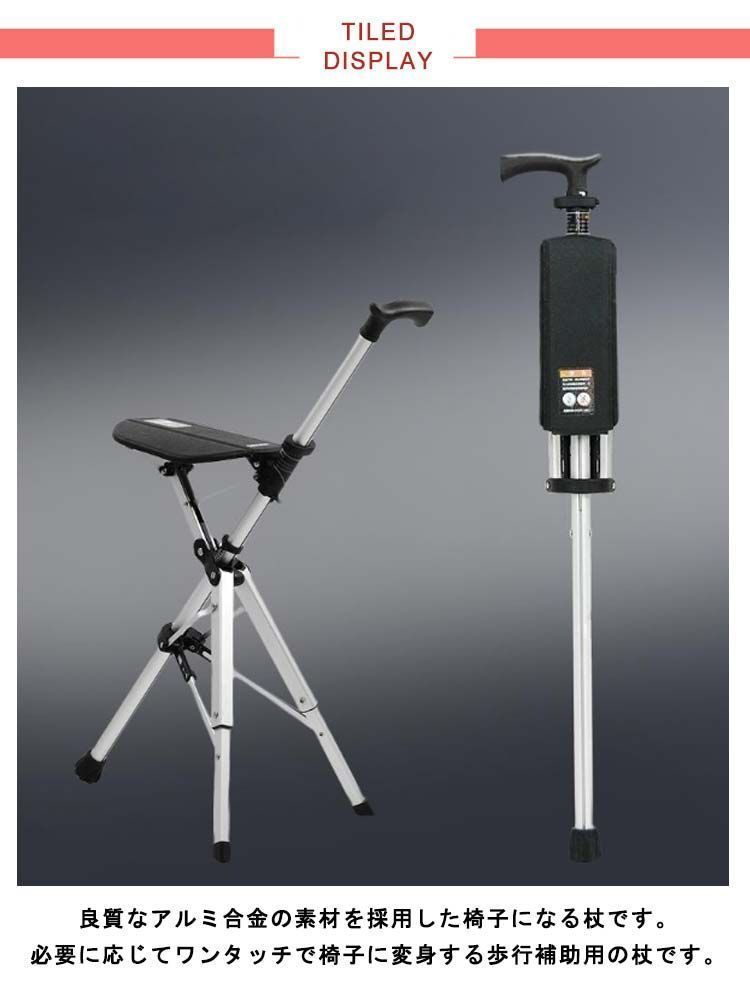 良質なアルミ合金の素材を採用した椅子になる杖です。必要に応じてワンタッチで椅子に変身する歩行補助用の杖です。