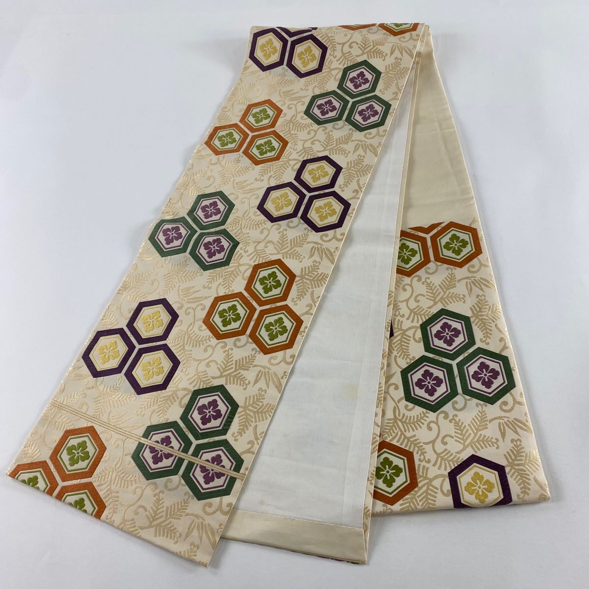 開き名古屋帯 喜多川平朗 亀甲 花 刺繍 クリーム 正絹