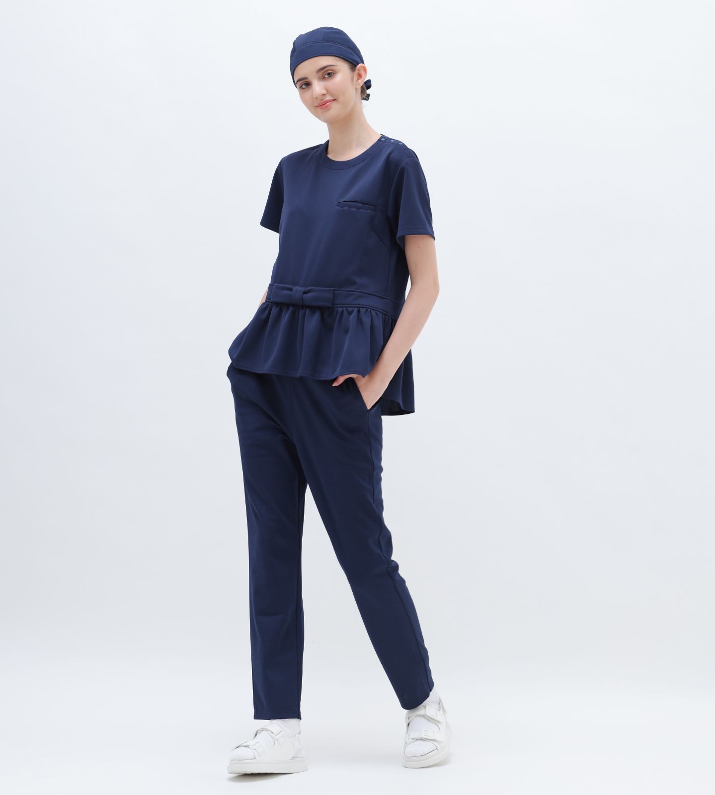 医療スクラブ 医療ユニフォーム おしゃれスクラブ Ribbon Peplum Shirt_NAVY 05