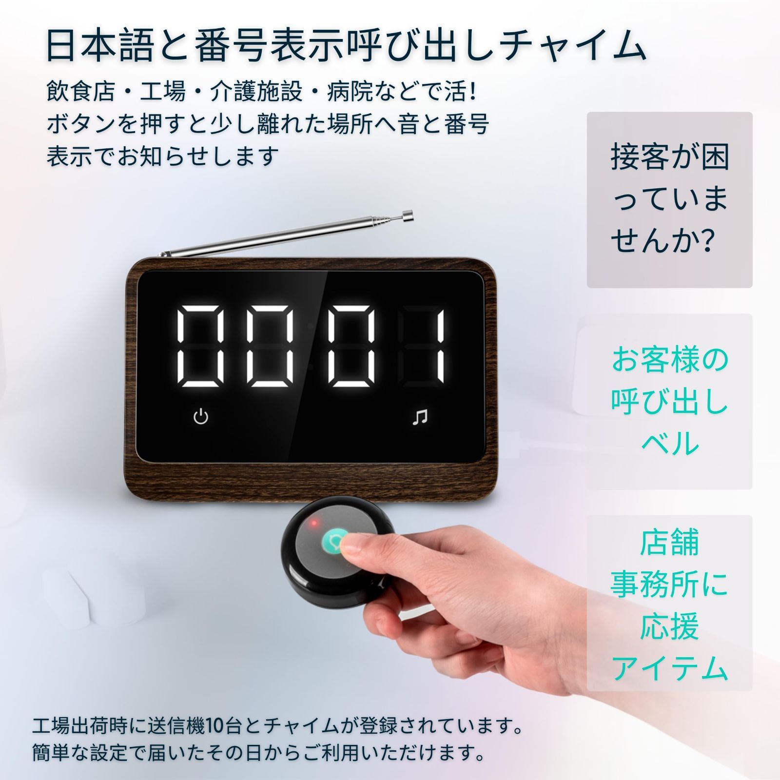 Callovo 呼び出しベル 飲食店 ワイヤレスチャイム 呼び出しベル 呼び鈴 卓上ベル 店舗用チャイム コールボタン 日本語番号呼び出し 業務用 介護用 呼鈴【受信機1台+送信ボタン10個セット】ブラック 木目柄