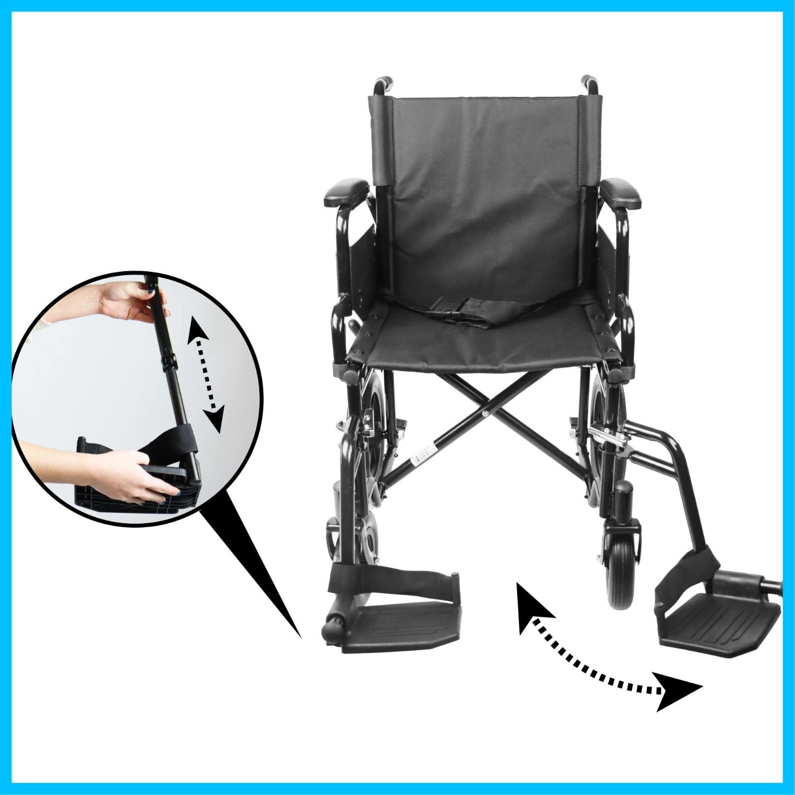 安全: フロントレバーを押すとロックブレーキが作動し、車椅子は完全に動かなくなります。フレームはスチール製であるため耐久性が高く、安全ベルトがサポートを強化します。最大耐荷重:113kg。