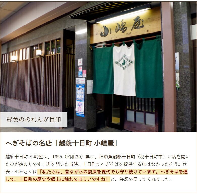 新潟名物「へぎそば」を提供する老舗「越後十日町 小嶋屋」から、乾麺タイプのへぎそばをご紹介。布海苔をつなぎに使用することで、なめらかなのど越しとコシの強さを楽しめるおそばに仕上げています。皇室献上を賜った逸品です。