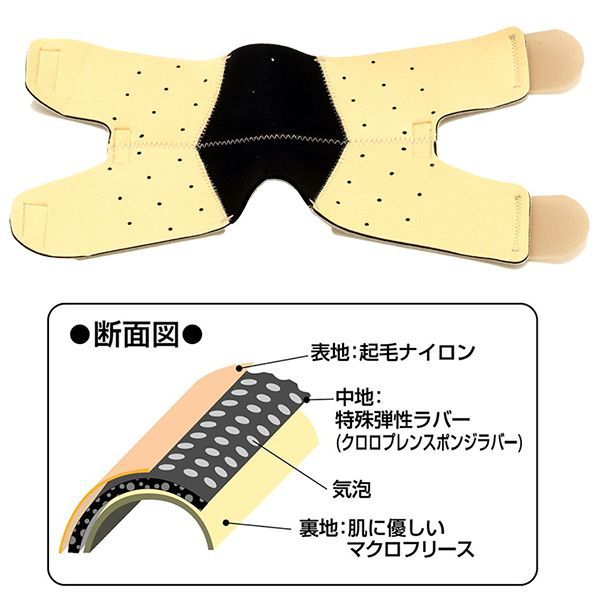素材は、日本製オリジナルのクロロプレンスポンジラバーを使用。ダイビングのウェットスーツやアスリートのサポーターなどに使われる身体を守る、人体になじみやすい素材です。無数の独立発泡気泡が作り出す豊かな弾力性・柔軟性と、体温を逃がさない保温性を持っている素材です。筋肉や関節の動きを邪魔しませんので、長時間の使用での筋力の低下も心配ありません。使うほどに体になじんでフィットします。