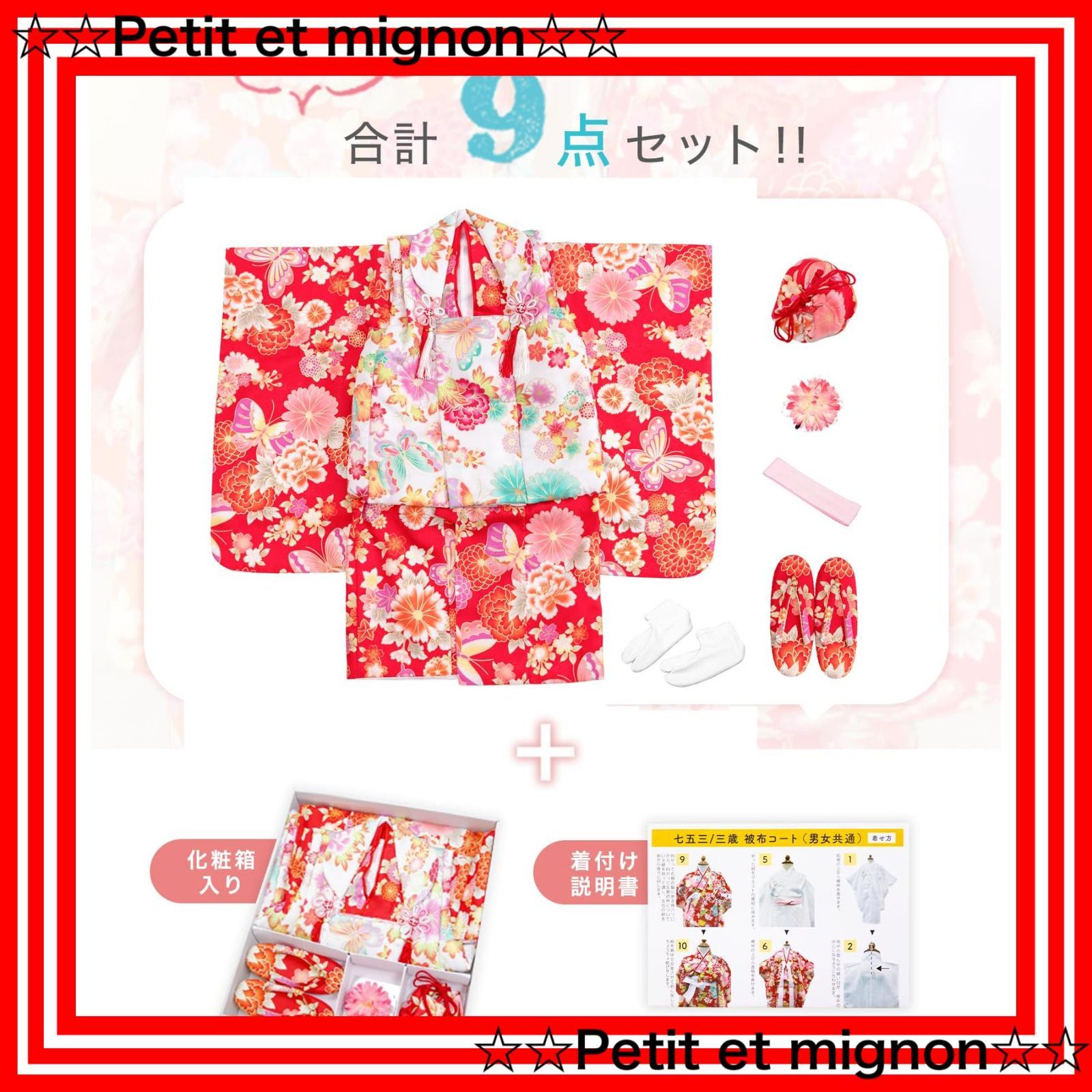 [セット内容]:被布/着物/伊達衿/長襦袢/髪飾り/巾着/草履/腰紐/足袋/専用化粧箱 [品質と素材]:ポリエステル100% [生産国]:中国