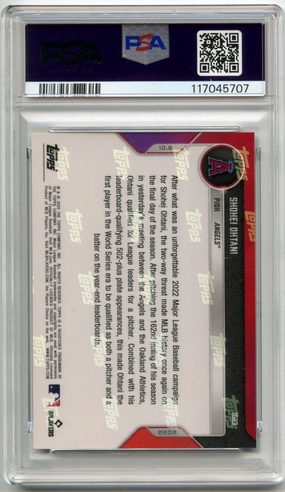 世界最大そして最も信頼されている第三者トレーディングカード真贋鑑定・グレーディングサービス会社PSAにおいて、大谷翔平選手の前人未到の記録達成を記念して発行されたトップス・トレーディングカードを鑑定したものです。10点満点中10点の完璧な状態(GEM MINT)の鑑定結果を得たカードです。PSA専用のケースに入っております。