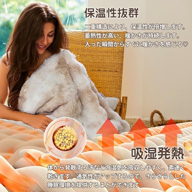 【冬の必須な毛布】うさぎの毛皮のように柔らかくふわふわブランケット、ふわっと軽くやわらかい肌触り、柔らい感触を体に感じます。触り心地も最高なふわふわ生地、圧迫感もない、膝や体にかけてふわふわで気持ちいいです。吸湿発熱わたが、寝ている間の汗を吸ってくれるためムレにくく、保温性にも優れている、快適に安眠できます。