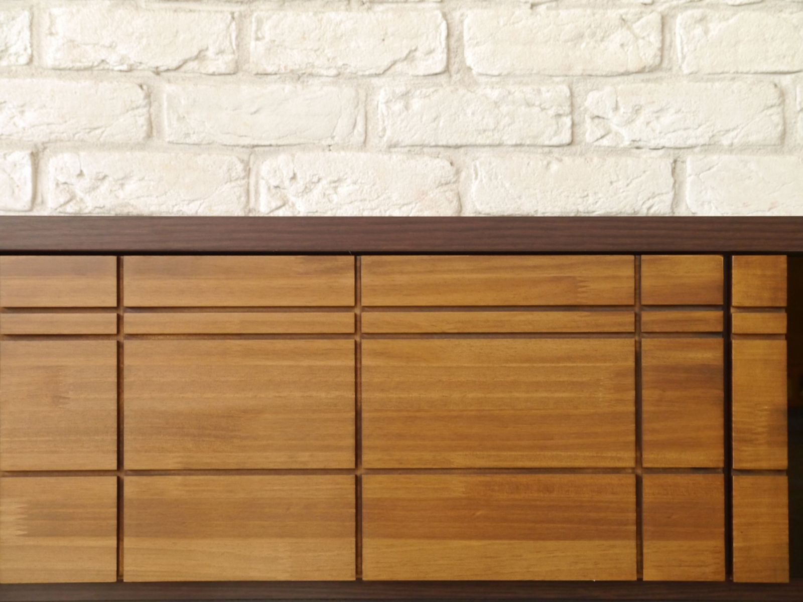 フラップ扉と引出・扉収納の3つの異なる収納を持った、シンプルな中にも使い勝手も良いローボード。