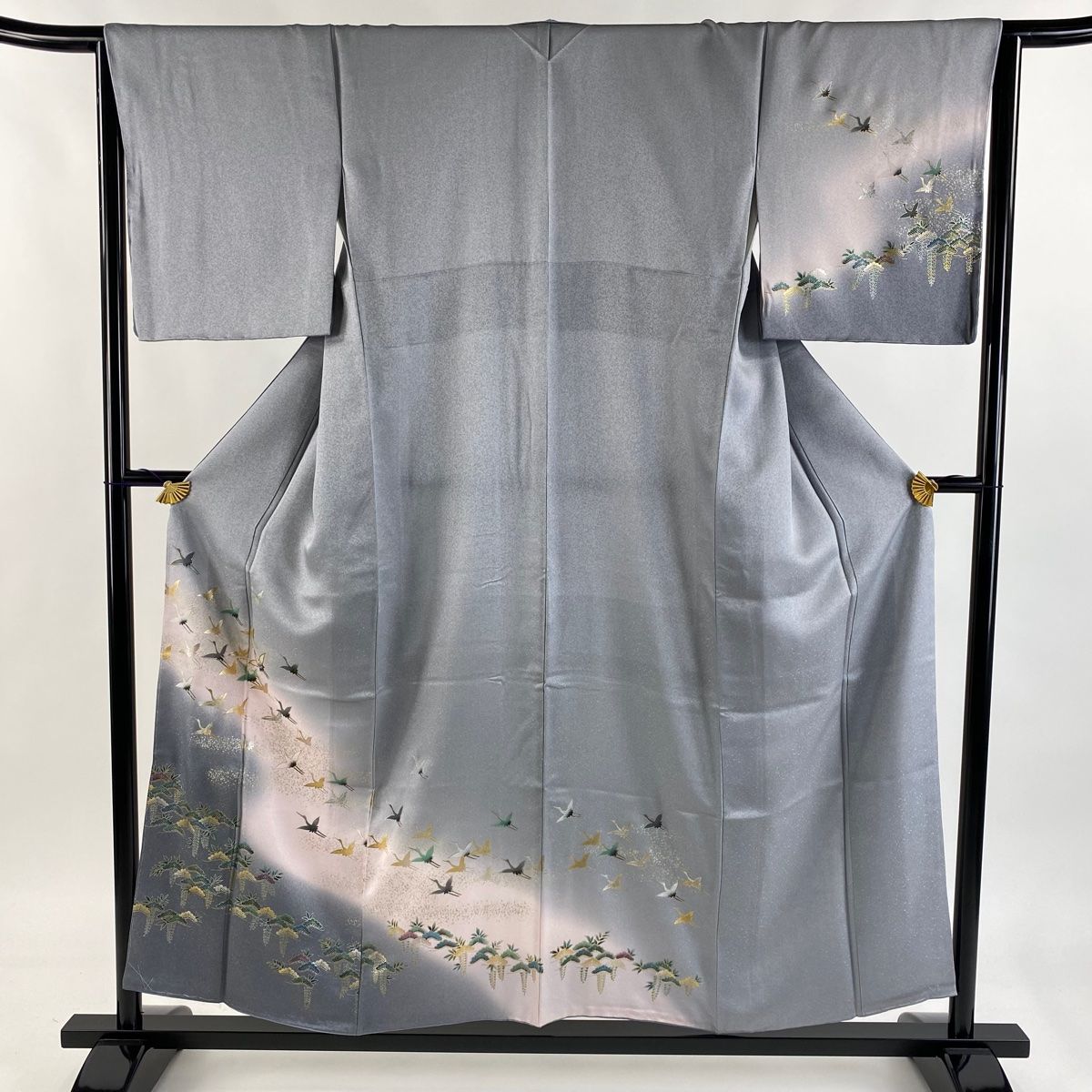 付下げ 身丈156 cm 裄丈64 M 袷 鶴 松 螺鈿 金銀彩 灰色 正絹 秀品
