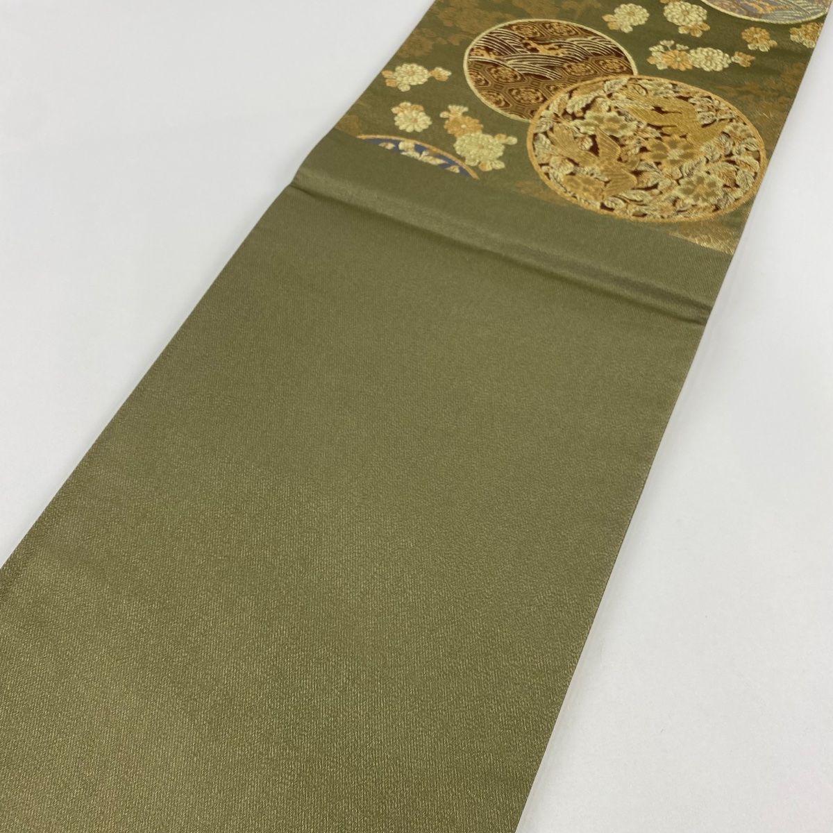 袋帯 秀品 本金箔蒔絵 花鳥 波 金糸 箔 鶯色 六通 正絹