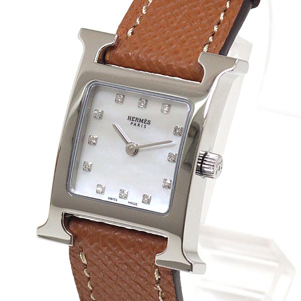 HERMES エルメス レディース腕時計 Hウォッチ HH 1.210 ホワイトシェル 12 Pダイヤ 社外ベルト クォーツ 仕上げ済