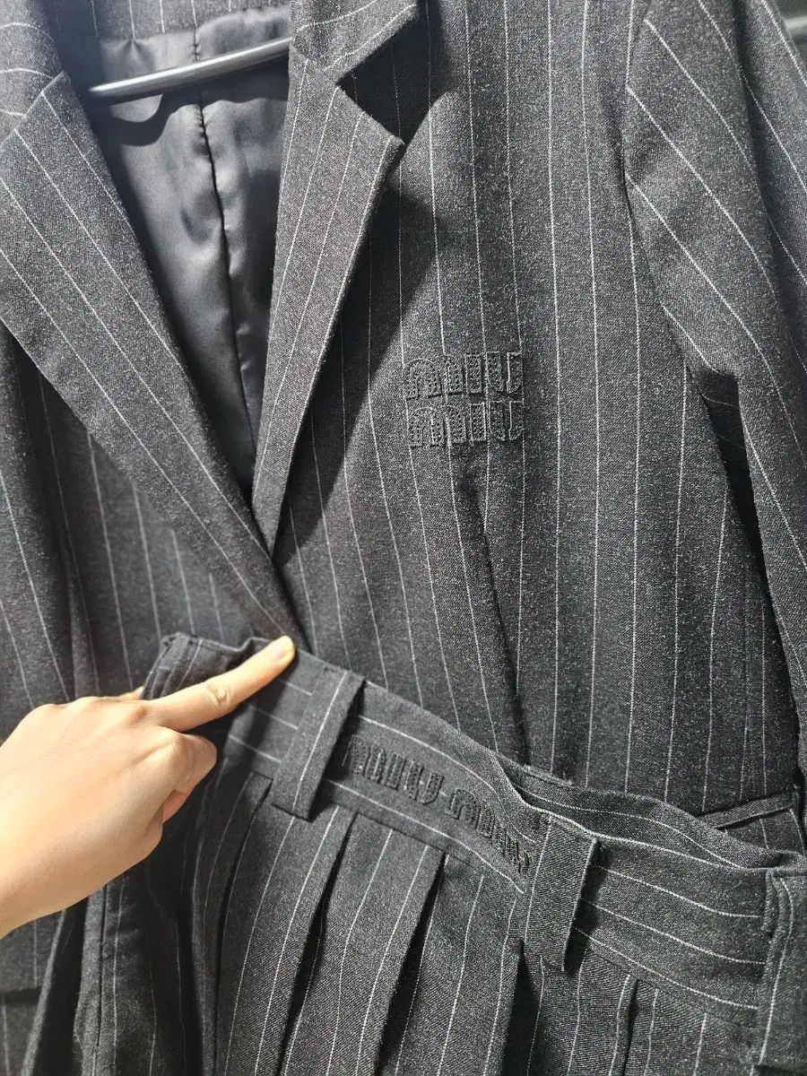 ミュウストライプのセットアップです。ジャケットにはミュウミュウのロゴが刻印されています。スカートにはプリーツとシワがあります