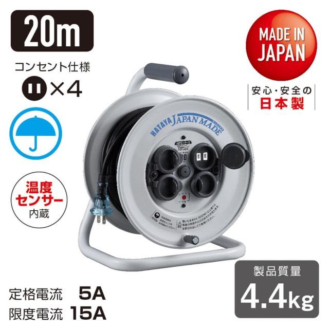 ●JAPANMADEシンプルデザインの屋外用防雨型コードリールです。●雨中や水がかかる場所でも安心です。●便利に使える防雨型のコードリールでコンセントの防雨・防塵キャップは一体成型タイプを採用しており、開閉が簡単です。●電線の溶解・焼損を防ぐ温度センサー付(※CC-20S型のみ)で、巻いたまま長時間使用したり定格電流を超えて使用すると起こる電線の異常な温度上昇を感知し、コンセントへの給電をスします。●温度センサーは自動復帰型です。