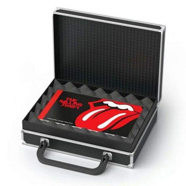 特注のフライトケースプレゼンテーションボックスは、ローリング・ストーンズのアートワークで飾られ、