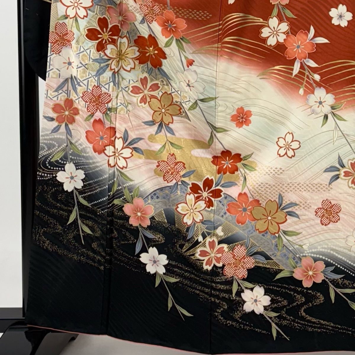 振袖 身丈162 cm 裄丈65 M 袷 桜 流水 金糸 金彩 茜色 正絹 秀品