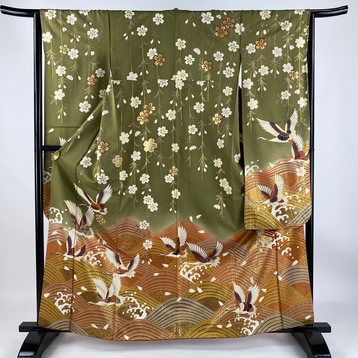 振袖 身丈161.5 cm 裄丈64 M 袷 鶴 枝垂れ桜 金彩 ぼかし 鶯色 正絹 秀品