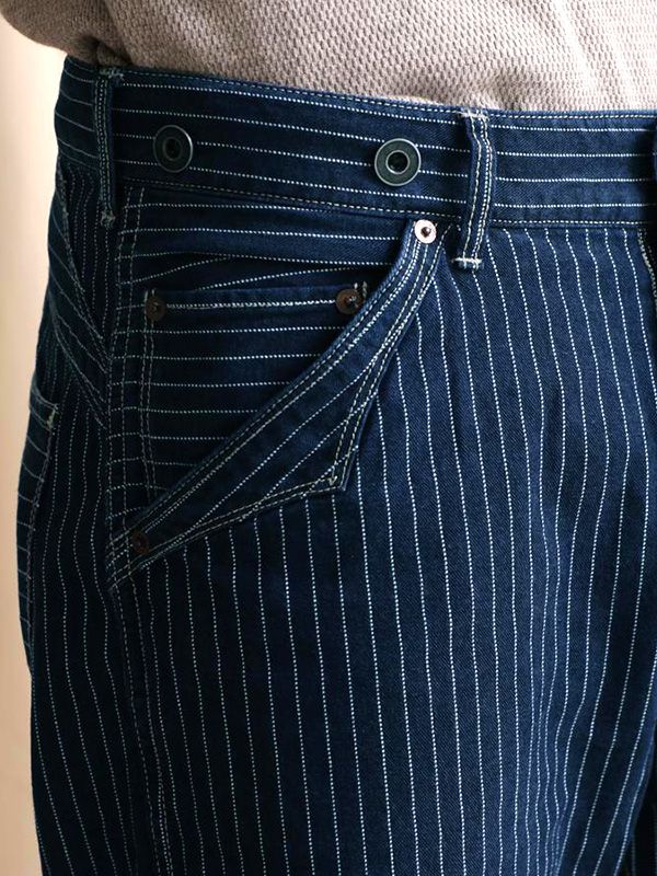 ヴィンテージのディテールシンチバックやサスペンダー釦、バックポケットの位置が外側になっていたりと無骨なディテール。