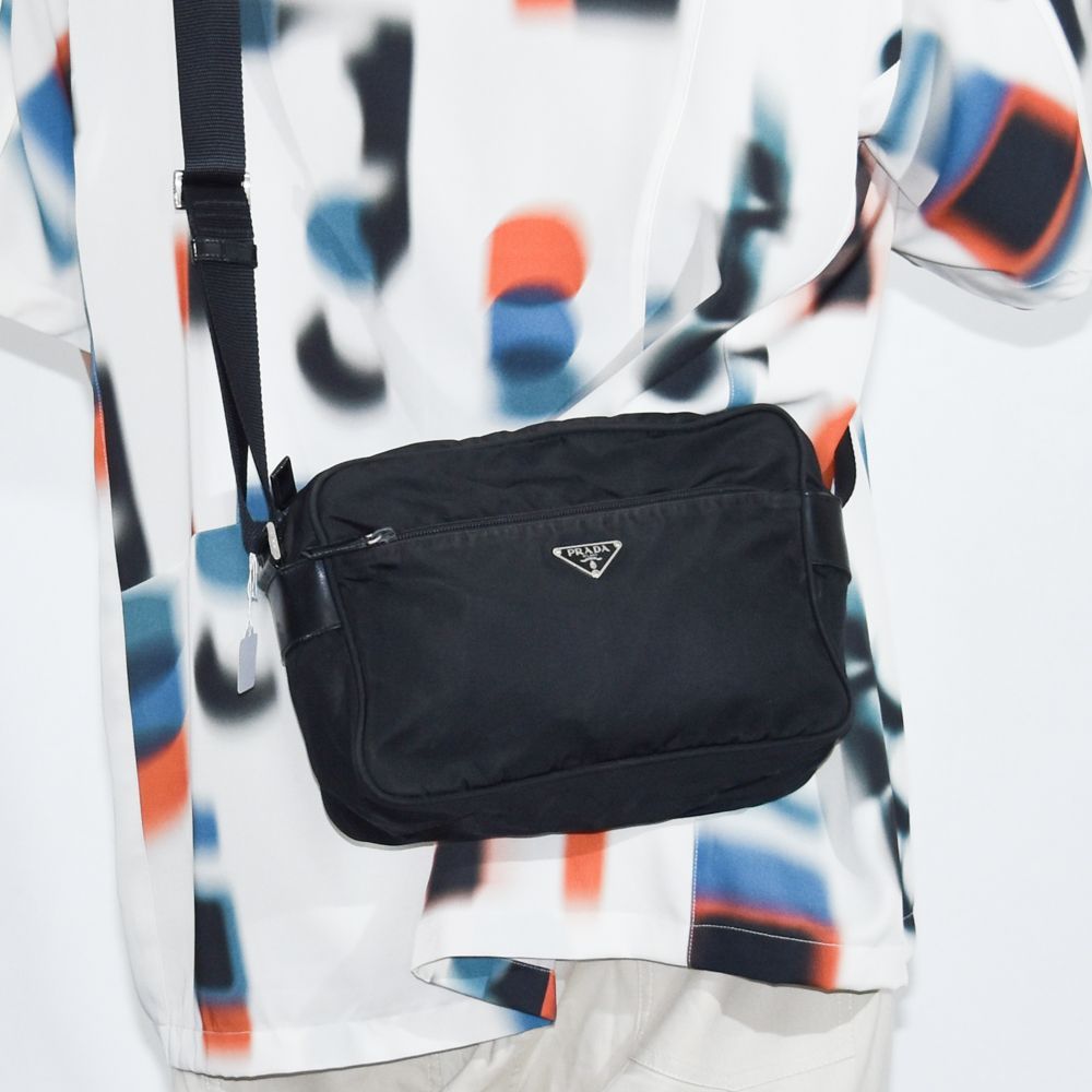 ヴィンテージPRADA 定番のナイロンショルダーバッグ。フロントやインナーにファスナーポケットがあり使い勝手のいい一品です。