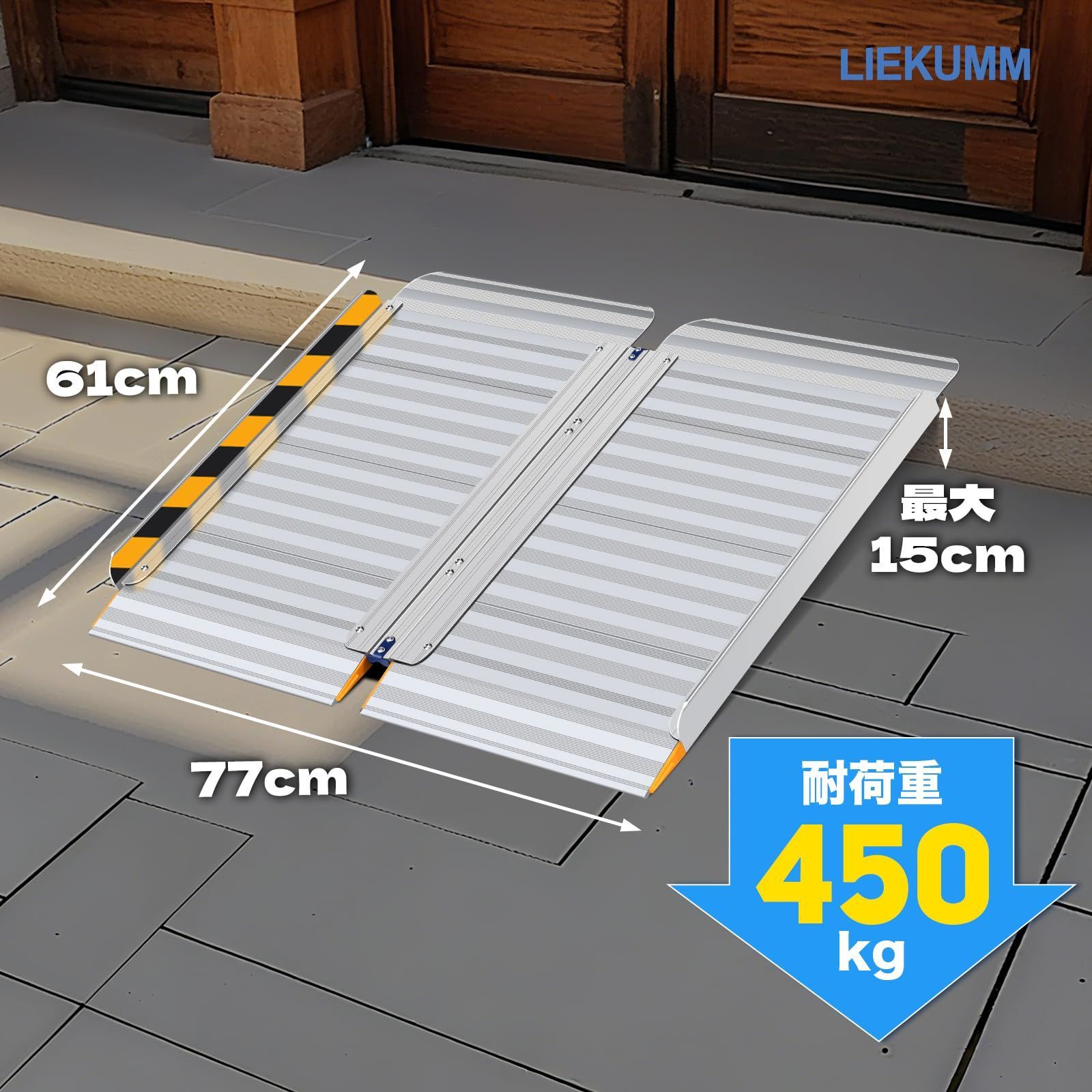 LIEKUMM 車椅子 スロープ 長さ61 幅広77 cm 耐荷重450 kg 軽量アルミ製 二重アルミ板 頑丈 段差スロープ 段差解消 折り畳み式 滑り止め ハンドル付き 玄関 階段 自転車 シニアカー ベビーカー 電動車椅子 高齢者 障害