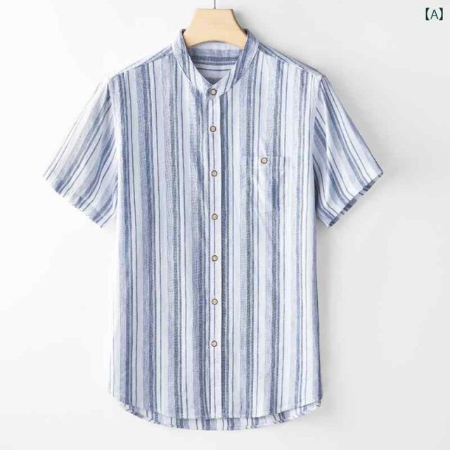 メンズ ファッション 服 男性用 オシャレ シンプル 大人 かっこいい 大きいサイズ ストリート 紳士服 夏 縦縞 リネン 半袖 シャツ カジュアル スタンドカラー レトロ 綿