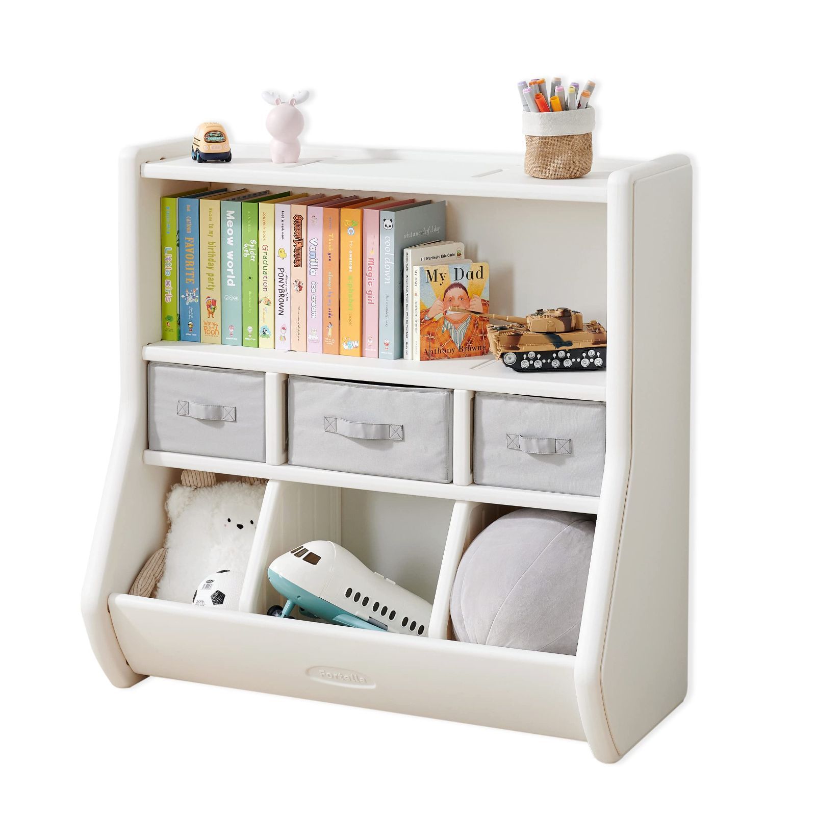 Fortella おもちゃ箱 本棚付き おもちゃ 収納 大容量 絵本棚 ラック 組み立て式 幅90x奥行43x高さ90㎝