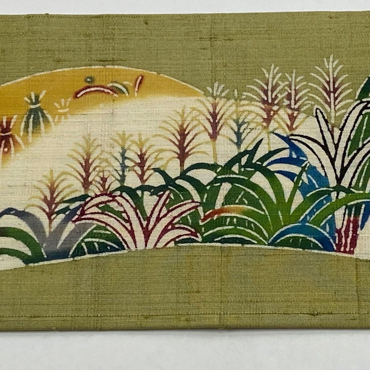 名古屋帯 紬地 葉柄 抹茶色 正絹