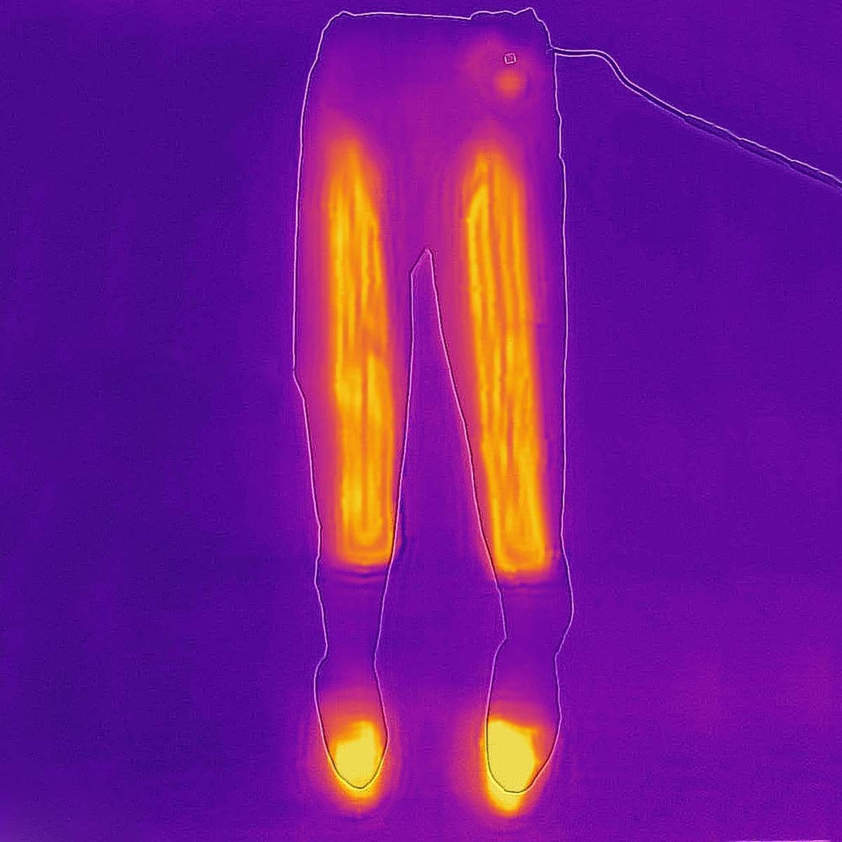 車載12Vバッテリーより給電する電熱インナータイツ。腿・膝・爪先にヒーターを内蔵し、冷えやすい下半身をしっかり温める。伸縮性に優れ、腰から爪先までをカバーしながらも動きやすさ抜群。
