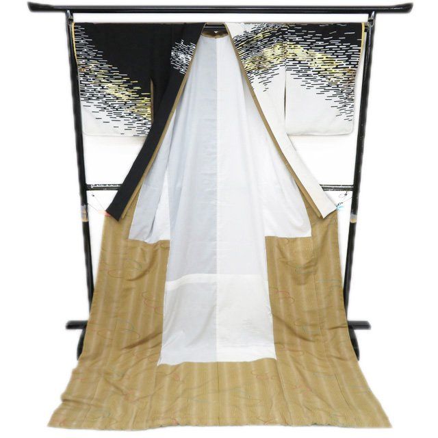 引き摺り 引摺り 引きずり 舞台衣装 着物 ポリエステル 霞模様 白色 黒色 金 身丈231 cm 裄70.5 きもの北條 A 1293-12