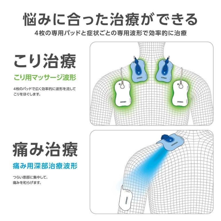 ●こり用マッサージ波形と 4枚のパッドで広範囲を治療