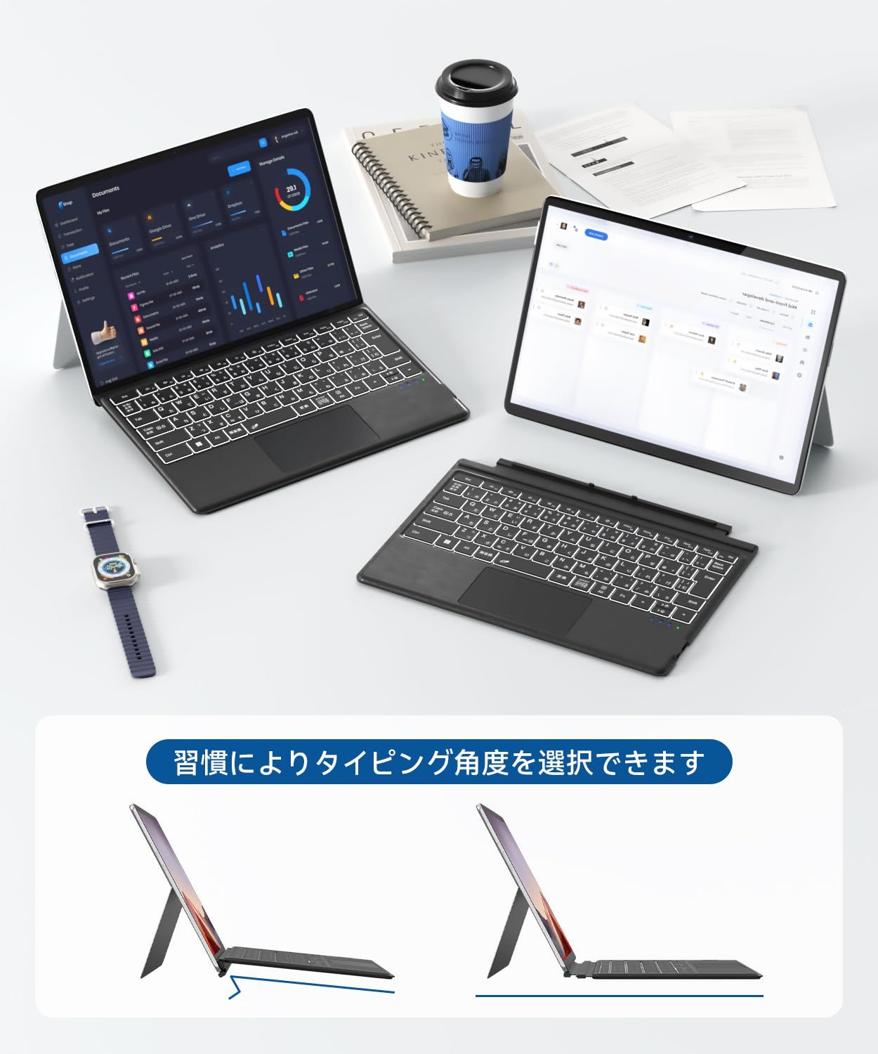 ?【磁石吸引&脱着式&カバー兼用 】surface pro5 キーボードはマグネット吸引で、タブレットもすぐにノートパソコンのように使います。 またマグネットの力でモニター側を折りたたんで、タイピングする時に15°の傾斜に作れ、実は腕への負荷をかなり抑えます。