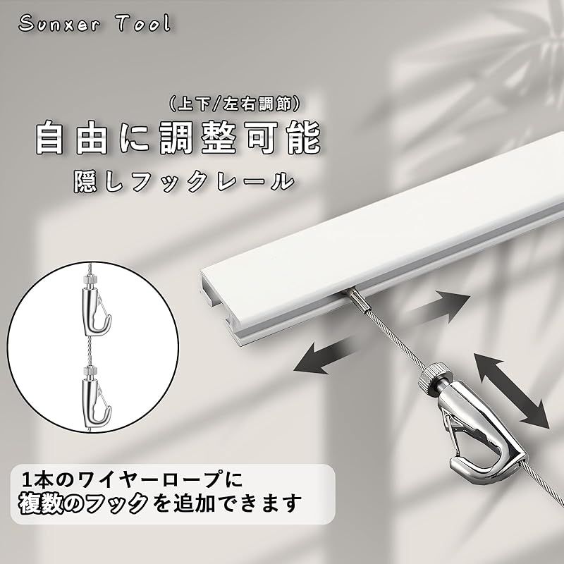 【自由調整】レールは上下左右に自由に位置を調整できます。ワイヤーは左右の位置を調整でき、フックは上下の位置を自由に変更できます。また、必要に応じてフックを追加して、複数の作品を展示することができます。